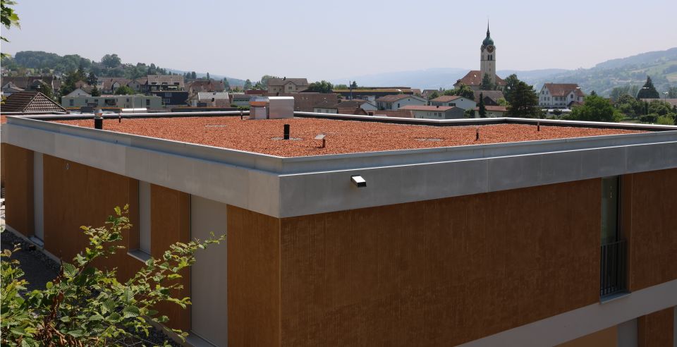 Die Attika ist die Aufkantung am Dachrand, die das Flachdach einfasst. Sie erfüllt mehrere Aufgaben: Die Abdichtung wird an der Attika hochgezogen und dort befestigt – das schützt den kritischen Übergang von Dach zu Fassade. Ausserdem hält die Attika Kies oder Substrat auf dem Dach und verhindert, dass Wasser unkontrolliert über die Fassade abläuft.